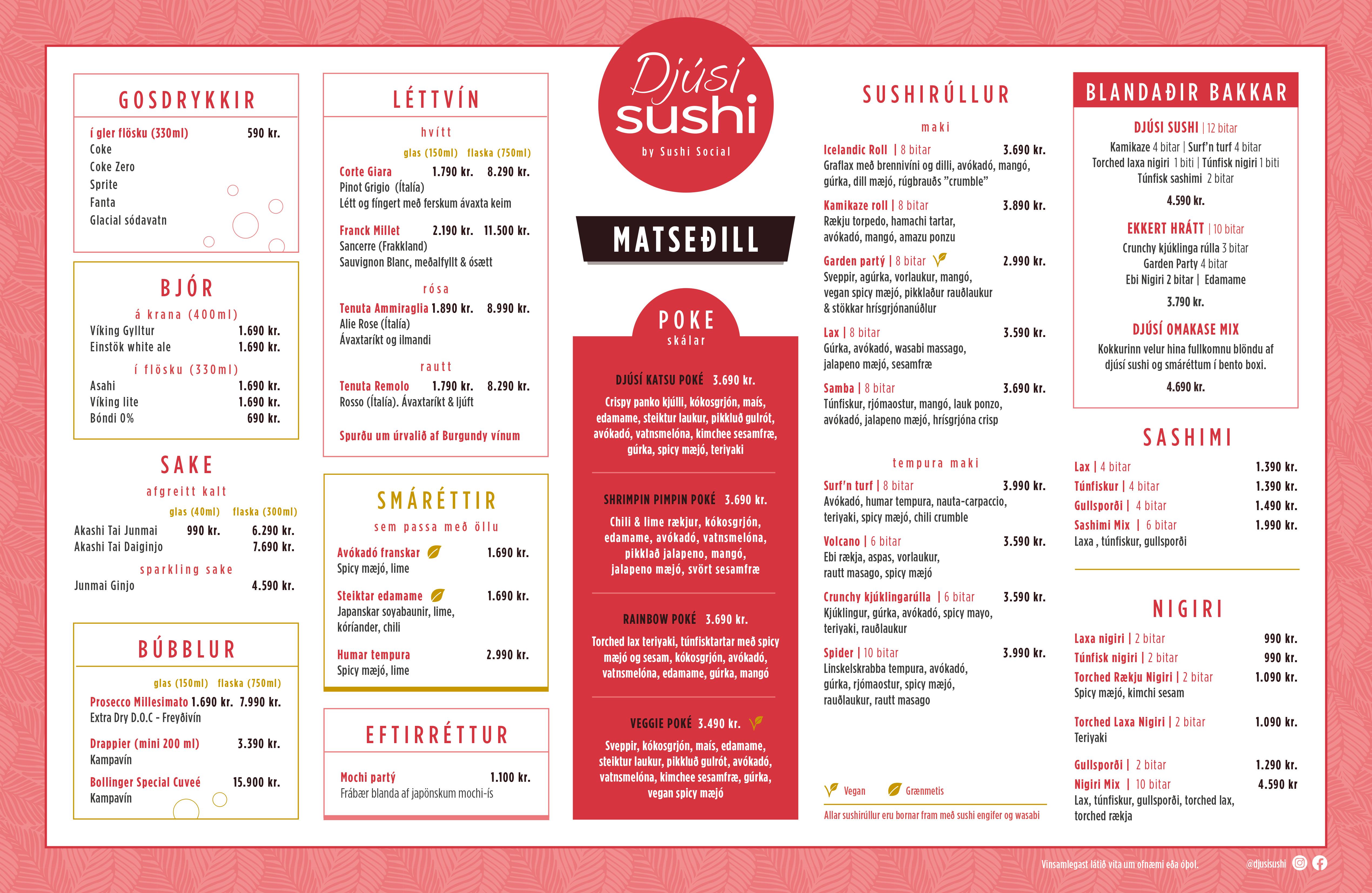 Djúsí Sushi er systurveitingastaður Sushi Social og staðsettur í Pósthús Mathöll. Staðurinn býður upp á handgert gæðasushi, poké skálar og smárétti til að njóta á staðnum eða taka með.
